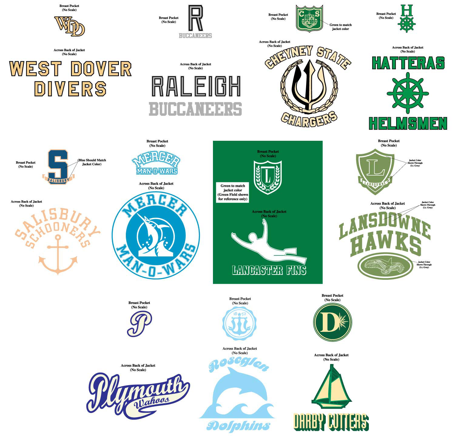 Set of period-specific school swim team logos, 1964-1974